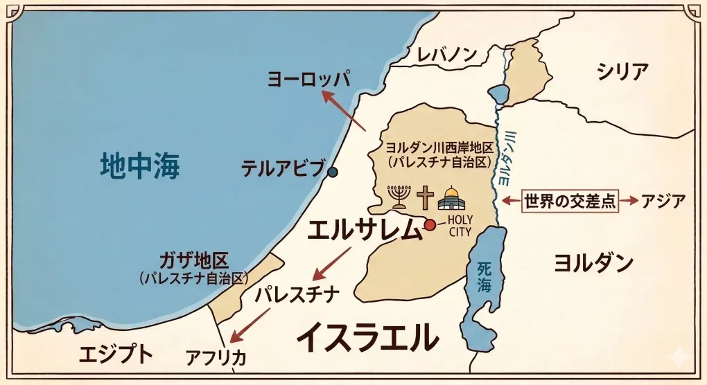 そして地理的な視点から見ましても、この地は極めて特異な宿命を背負っております。 パレスチナは、「アジア」「アフリカ」「欧州(ヨーロッパ)」という三つの大陸を繋ぐ架け橋の如き場所に位置しております。